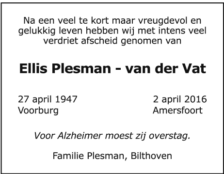 mijn vaders zus die op haar 58ste helaas werd getroffen door alzheimer, waardoor zij 10 jaar heeft geleefd in onwetendheid.